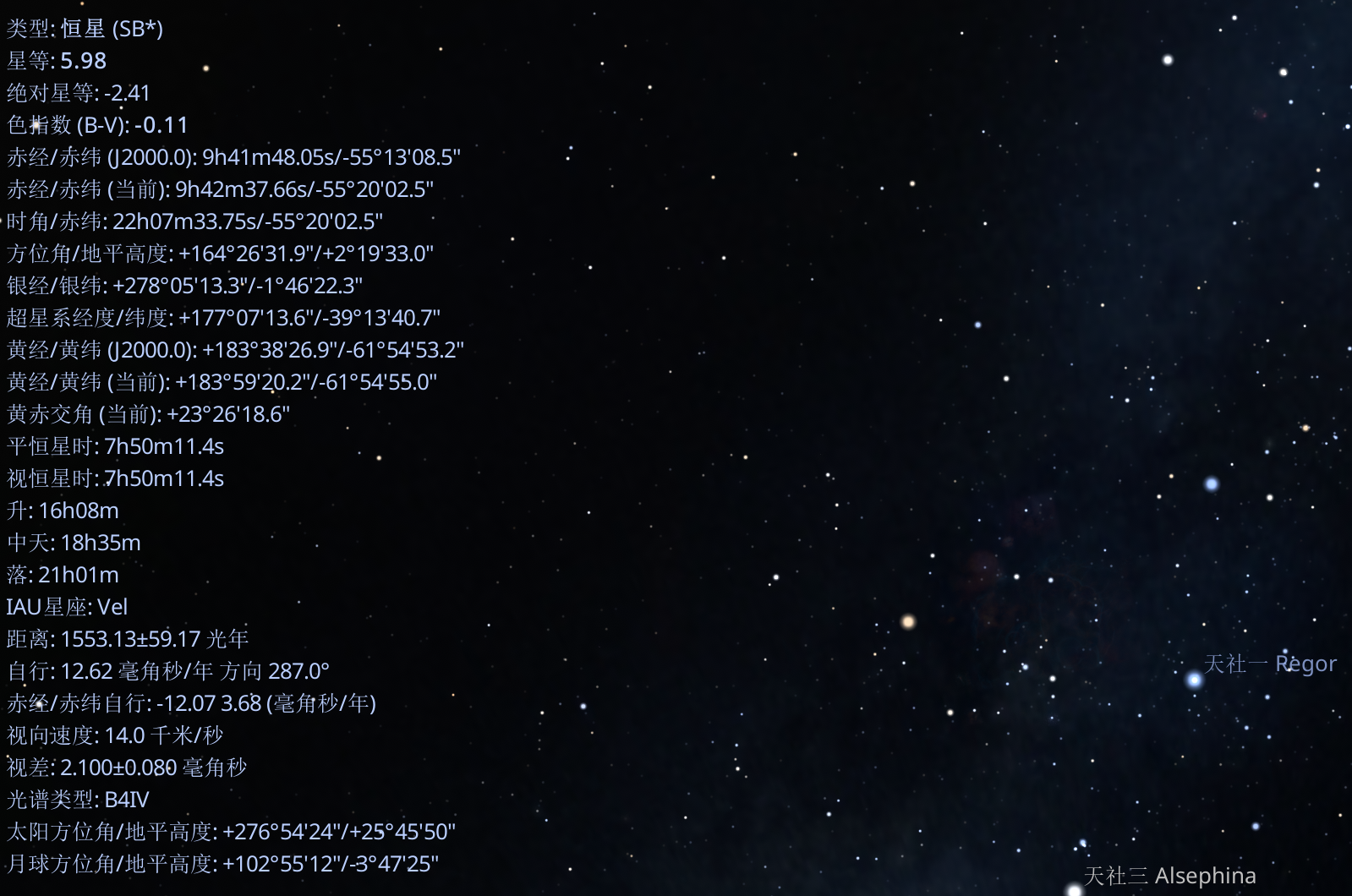 - 详细信息:点击任何天体,左上角显示详细信息(右键点击隐藏),包括名称,类型,距离,亮度,赤经赤纬坐标等,