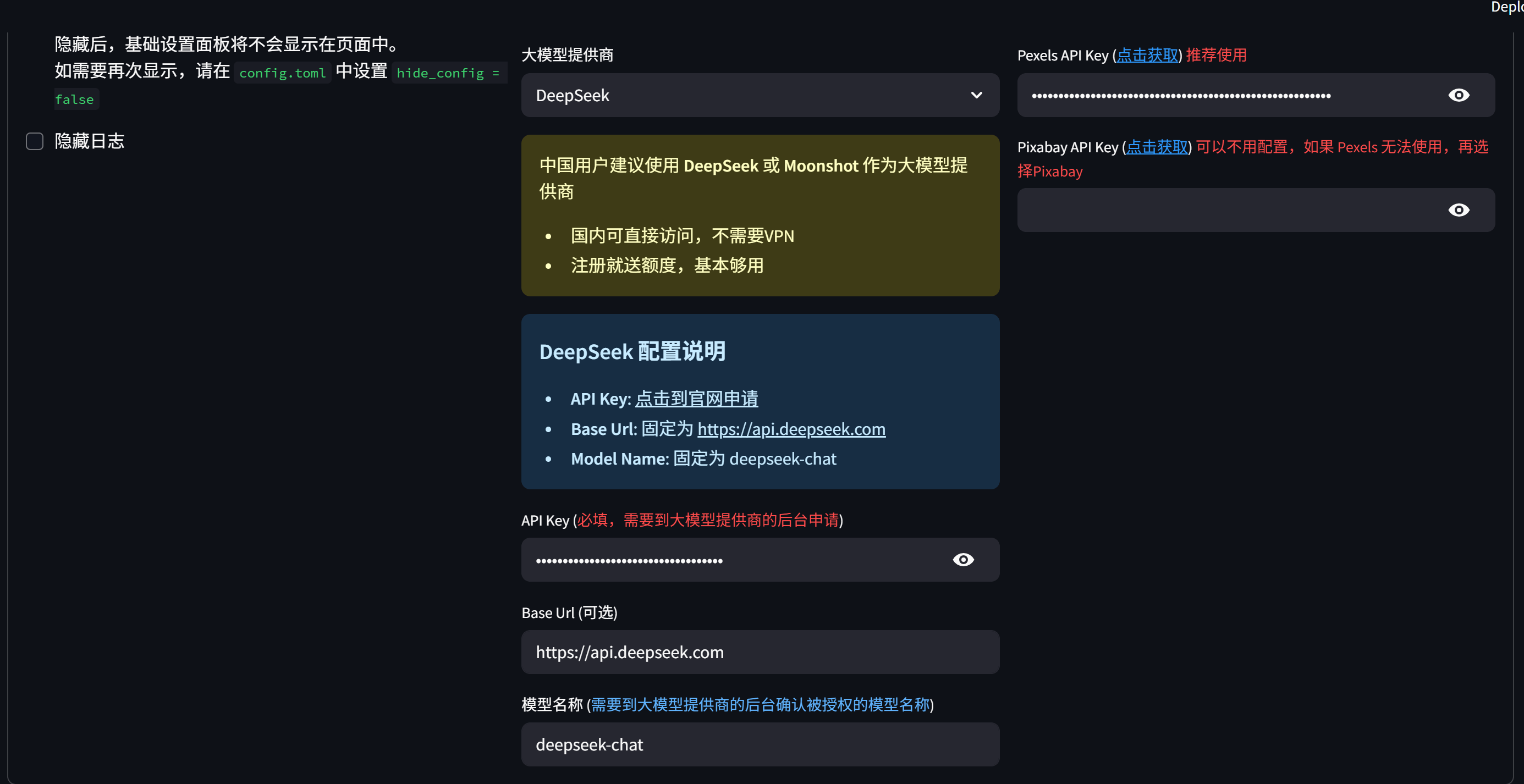 首次进入需要配置大模型的api,虽然这个付费,但是费用真的非常低,几乎可以忽略。另外你不适用也可以,可以直接粘贴你生成好的文本放过来。