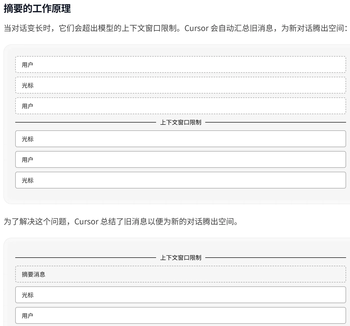 短期记忆:如果对话持续了一段时间,则创建对话摘要并在将来使用(比如Cursor的自动摘要,它用小模型进行摘要总结)。